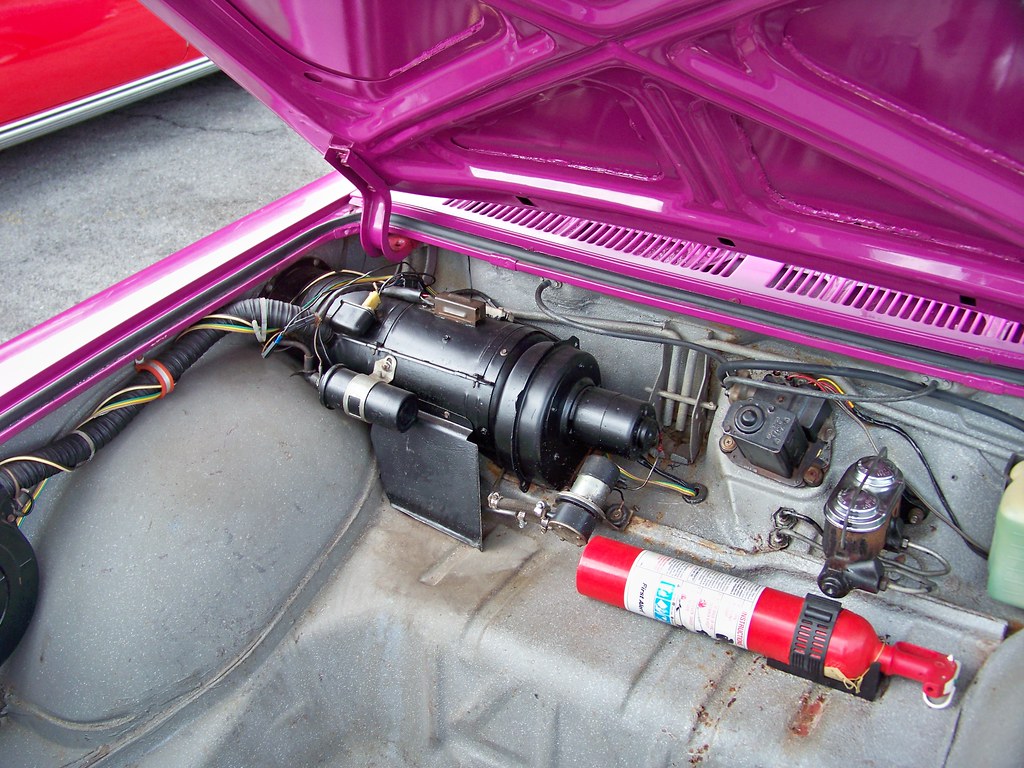 With the heat exchanger, the heater blower had to be located in the engine compartment on the firewall. Without it there was room for the blower to be mounted below the heater box itself, which now served as a mixing chamber for combining temperate engine compartment air and hot lower engine air. The temperate air was then given a boost up to the heater box by the engine’s fan via a hole in the front of the top shroud and then through a short hose and duct.