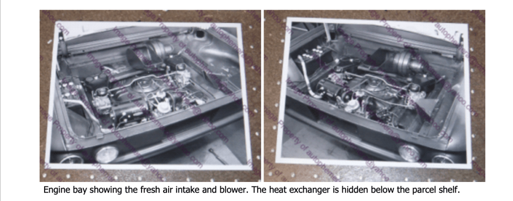 According to the brochure, “The engine heat is utilized by an air heat exchanger to efficiently warm incoming outside air. The heated air is distributed through four rectangular air outlet nozzles in the passenger compartment. The heat exchanger core is filled with thin copper fins to effect a continuous heat transfer path.”